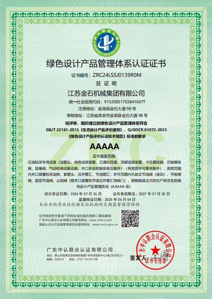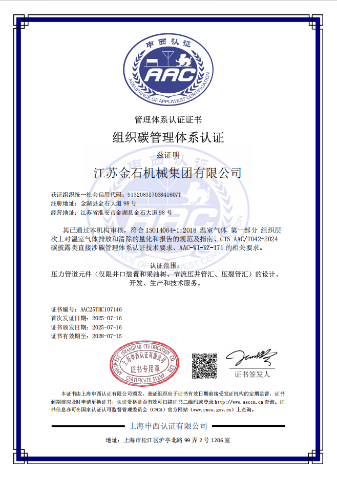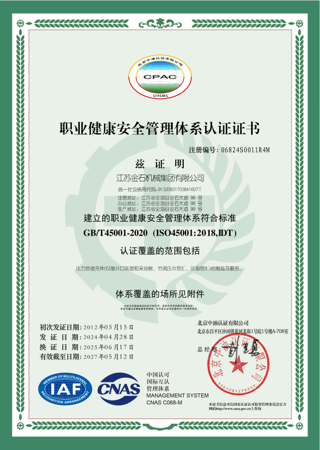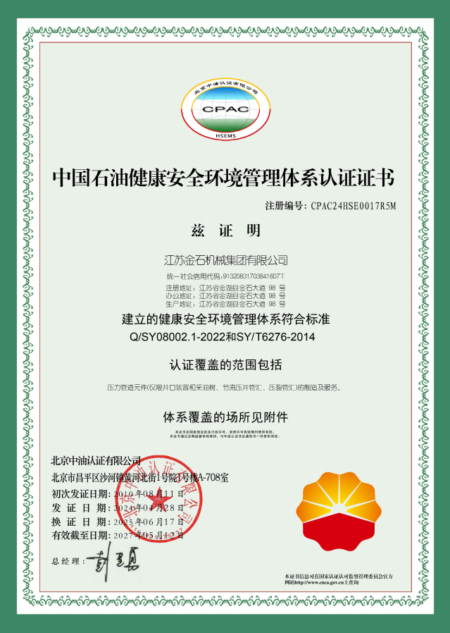 江苏金石机械集团有限公司(JMP)起源于1960年成立的金湖机械厂,自1974年开始生产井口设备。至今,JMP已拥有逾五十年制造井口设备的经验。作为中国较早从事井口设备制造的企业之一,JMP早在1995年就获得API 6A认证。此后,JMP又相继获得了包括API 16C、API Q1、API 5CT、ISO 9001、ISO 14001及ISO 45001在内的多项权威认证,凭借可靠的产品质量与技术能力,持续服务国内外客户。