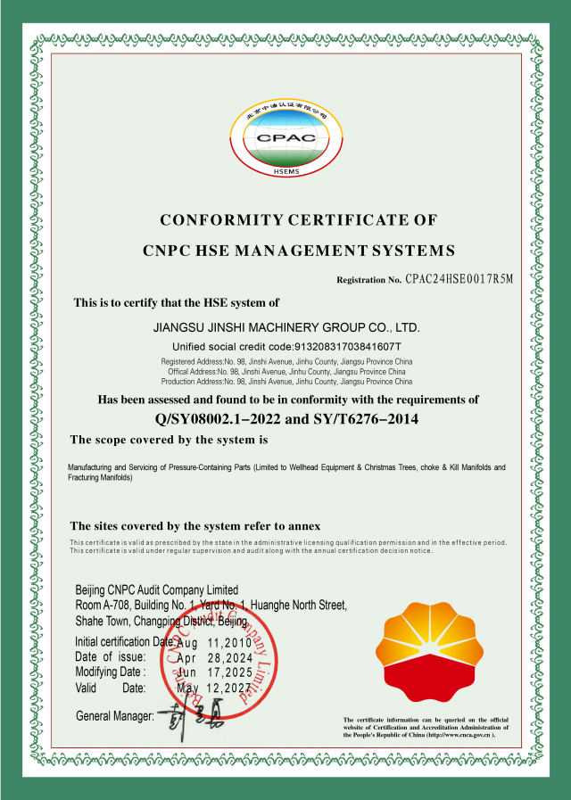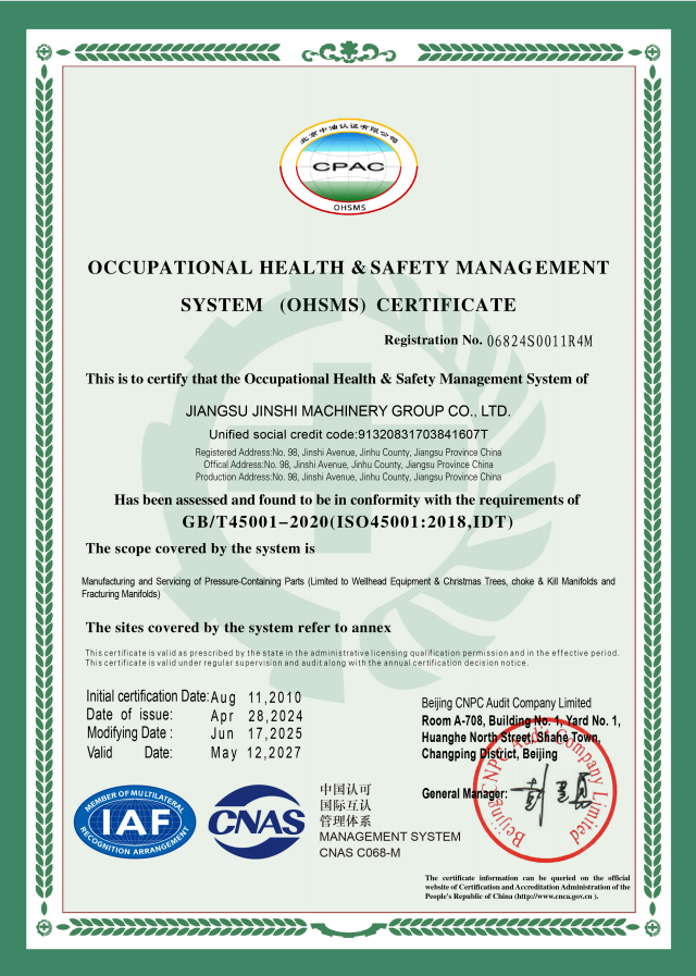 Jiangsu Jinshi Machinery Group Co., Ltd. (JMP) originated from Jinhu Machinery Plant, founded in 1960, and began manufacturing wellhead equipment in 1974. Up to now, JMP has over fifty years of expertise in manufacturing wellhead equipment. As a pioneer in China for wellhead equipment industry, JMP became one of the earliest domestic enterprises to obtain API 6A certification in 1995. Since then, JMP has earned a suite of prestigious certifications, including API 16C, API Q1, API 5CT, ISO 9001, ISO 14001, and ISO 45001, positioning itself as a benchmark of quality and innovation in China’s oil and gas equipment sector.